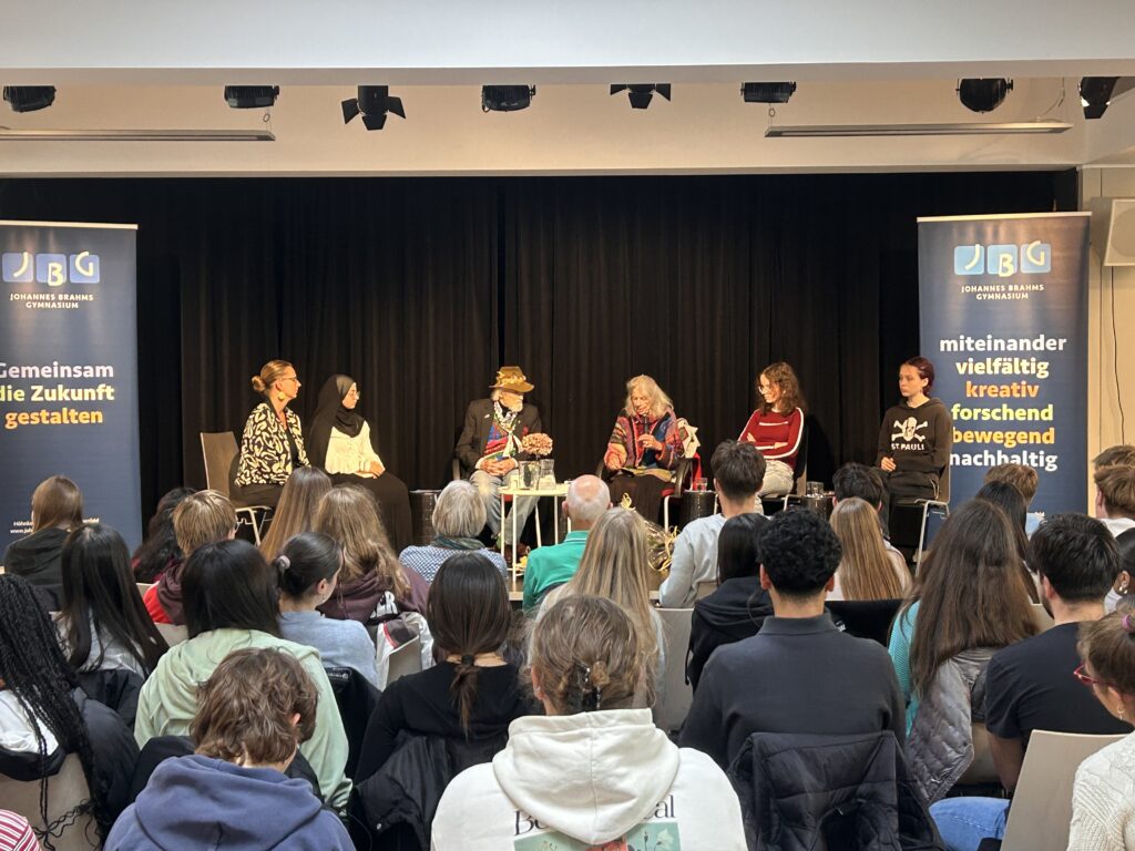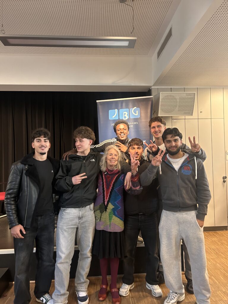 Marione Ingram, geboren 1935 in Hamburg als Marione Oestreicher, war am 1. Oktober 2025 zu Gast am Johannes-Brahms-Gymnasium und hat ca. 150 Schülerinnen und Schülern der 10. Klassen und der Oberstufe auf eindrucksvolle Weise von ihrer Kindheit in der NS-Zeit erzählt. Ihre Mutter war Jüdin, was schon früh zu Ausgrenzung und Diskriminierung führte. Viele Verwandte mütterlicherseits gerieten ins Visier der Gestapo, wurden deportiert und starben in den Lagern. Im Juli 1943 erhielt auch ihre Mutter für sich und ihre Töchter den Deportationsbefehl nach Theresienstadt. Doch kurz zuvor begann der Hamburger Feuersturm, eine verheerende Bombenkampagne, die das Leben vieler Menschen zerstörte – aber das von Marione und ihre Mutter in gewisser Weise rettete. Der Luftschutzkeller wurde ihnen verwehrt, sie flohen durch die brennenden Straßen Hamburgs, fanden kurzzeitig Schutz in einem Bombenkrater und später gelang es Marione, sich mit ihrer Mutter und den Schwestern für etwa 18 Monate in einer Hütte bei Rahlstedt zu verstecken. Nach Kriegsende erlebte Marione weiter, dass das Leben nicht sofort sicher war, denn Nachwirkungen von Antisemitismus und Vorurteilen blieben, in ihrer Schule wurde sie von Mitschüler*innen und Lehrkräften drangsaliert. Als Jugendliche wurde ihr bewusst, dass Schweigen keine Option sein darf. Mit 17 Jahren entschloss sie sich zur Auswanderung in die USA, wo sie später Schriftstellerin, Bürgerrechtlerin und Menschenrechtsaktivistin wurde. Ihre Geschichte hat uns nicht nur erschüttert, sondern auch inspiriert: Marione zeigte uns, wie wichtig es ist, sich für Mitmenschlichkeit, gegen Rassismus und Unterdrückung einzusetzen – nicht nur rückblickend, sondern jeden Tag aufs Neue. In ihrem Schlussappell forderte sie uns deshalb auf, gegen Ungerechtigkeit, Mobbing und Diskriminierung jeglicher Art aufzustehen. Sie ist uns ein Vorbild darin, ihre Offenheit, ihr Mut und ihre Lebensfreude haben uns tief beeindruckt!
